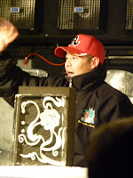 The bus then took us to the Ice Museum. I think it is owned by a Chinese family. They took and old building and redone it to suit their purposes. We went into a theatre like area where a young Chinese man tried to speak to us, but then he showed a film of the Ice Carving Contest that goes on in Fairbanks in March. People come from all over the world to compete. All around the room were large windows and when he turned on the lighting there were ice carvings he had done behind each of the windows. It was kept cold behind the glass and the sculptures were lit from the inside by "LED" lights. Then one large room in the front we could go into--about 40 degrees. There were two people with no faces that you could put your head thru and take pictures, a ice house with bed and pillow and tables which you could go into and then there were animals he had carved. When we had all gotten around the room he went into another large room and actually carved a beautiful rose in a square of ice. He was very hard to understand but his art was beautiful. That was our day out.